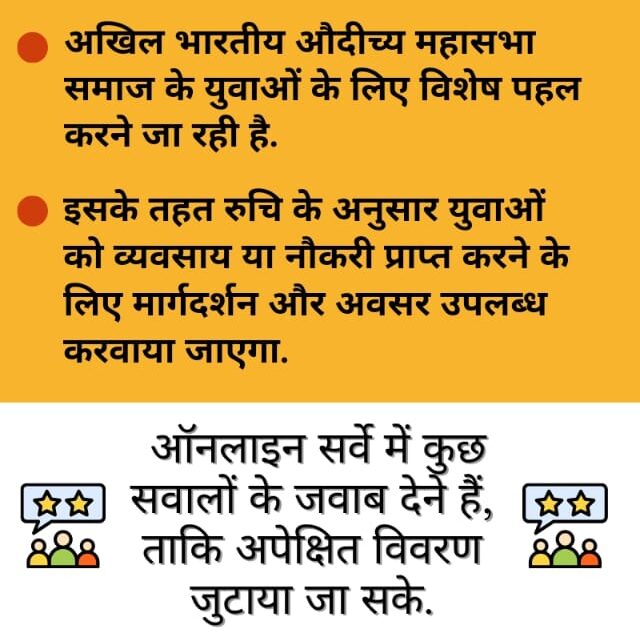 अखिल भारतीय औदीच्य महासभा समाज के युवाओं के लिए विशेष पहल करने जा रही है। इसके तहत रुचि के अनुसार युवाओं को व्यवसाय या नौकरी प्राप्त करने के लिए मार्गदर्शन प्रदान किया जाएगा। कुछ सवालों के जवाब आपको देने हैं, ताकि अपेक्षित सहयोग दिया जा सके।